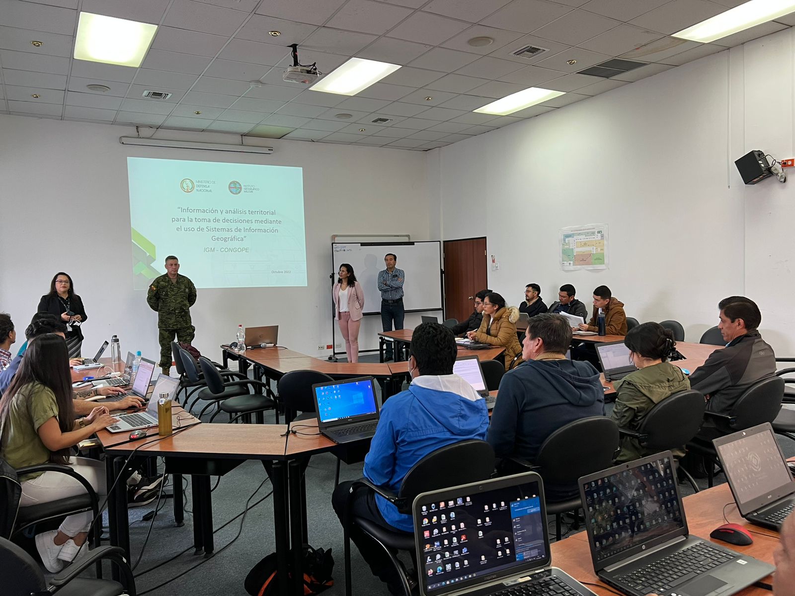 En el marco del convenio suscrito entre el Instituto Geográfico Militar del Ecuador y el Congope- Consorcio de Gobiernos Autonomos del Ecuador, se realiza la asistencia técnica en gestión de información geográfica a profesionales de los GADs de Imbabura, Carchi, Pichincha, Santo Domingo, Cotopaxi, Tungurahua, Chimborazo y Bolívar, lo que permitirá un trabajo articulado en apoyo al ordenamiento territorial de sus regiones.