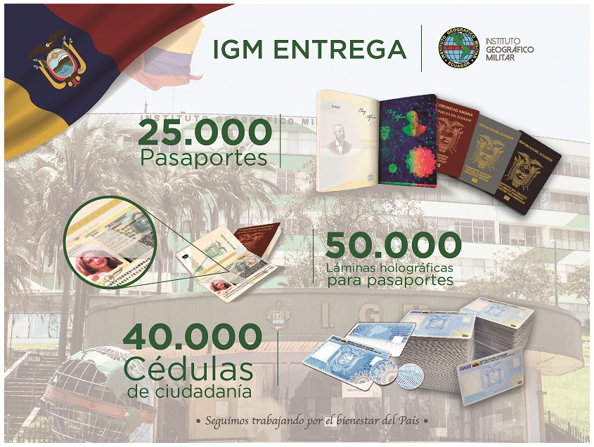 El Instituto Geográfico Militar del Ecuador, cumple con los compromisos adquiridos en beneficio de la sociedad ecuatoriana, a pesar de la crisis social que enfrentamos como país, realizamos la entrega al Dirección General de Registro Civil Identificación y Cedulación, de 40.000 cédulas de ciudadanía, 50.000 láminas holográficas para pasaportes y 25.000 pasaportes.
