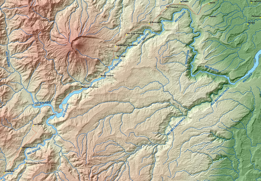 - El Río Quijos continúa aguas abajo hasta unirse con el Río Machacuyacu, formando el Río Coca.