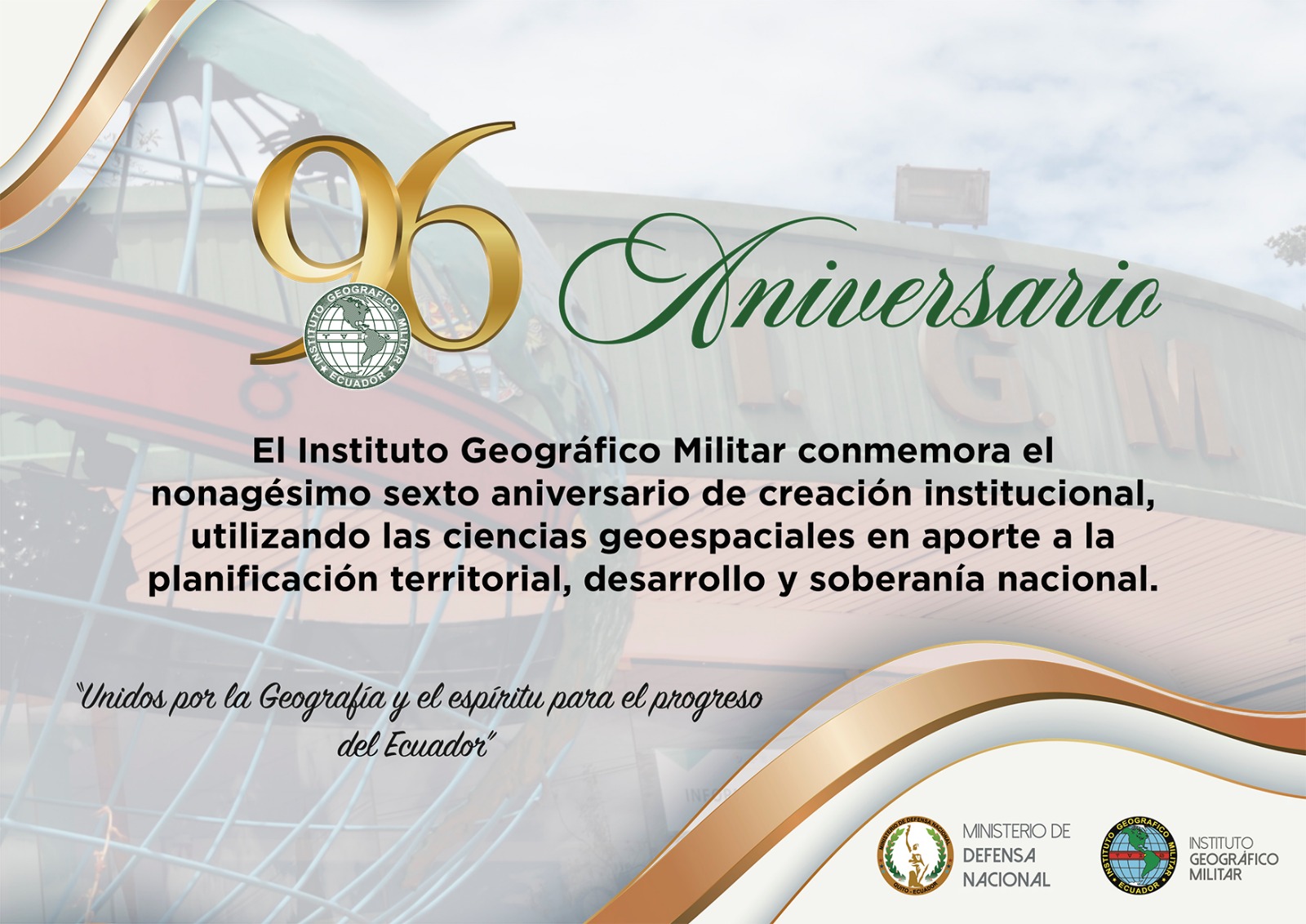 Este 11 de Abril el Instituto Geográfico Militar cumple Noventa y Seis años de experiencia en la elaboración de la cartografía oficial y el archivo de datos geográficos, cartográficos del Ecuador; estudios de aplicación geomática; fabricación de especies valoradas y documentos de seguridad como único organismo autorizado; realización de investigación y difusión de las ciencias geoespaciales.