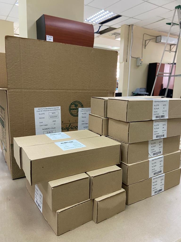En el marco del Contrato Nro. CGAJ-DAJ-CON-2022-001 para la entrega de tarjetas de policarbonato más táctil con chip, para la emisión de cédulas, el Instituto Geográfico Militar, 𝐞𝐧𝐭𝐫𝐞𝐠𝐚 𝐡𝐚𝐬𝐭𝐚 𝐞𝐥 𝐦𝐨𝐦𝐞𝐧𝐭𝐨 𝟐𝟐𝟓.𝟎𝟎𝟎 𝐜𝐞́𝐝𝐮𝐥𝐚𝐬 a ala Dirección de Registro Civil, Cedulación e Identificación, quienes realizan la validación de las tarjetas previa su entrega.