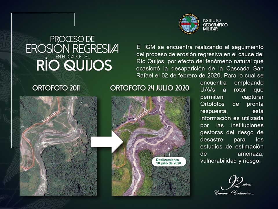 En cumplimiento a la Ley de la Cartografía Nacional, el Instituto Geográfico Militar del Ecuador apoya al Sector de Seguridad y Defensa, motivo por el cual, se encuentra realizando el seguimiento del proceso de erosión regresiva en el cauce del Río Quijos, por efecto del fenómeno natural que ocasionó la desaparición de la Cascada San Rafael el pasado 02 de febrero de 2020.