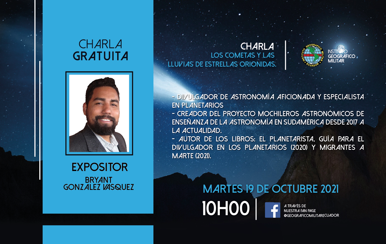 El Instituto Geográfico Militar continuando con el ciclo de ponencias enfocadas en la astrofísica y del universo, se complace en invitar a la Charla Gratuita: “Los cometas y las lluvias de estrellas Orionidas”, a través de nuestra FanPage: @GeograficoMilitarEcuador