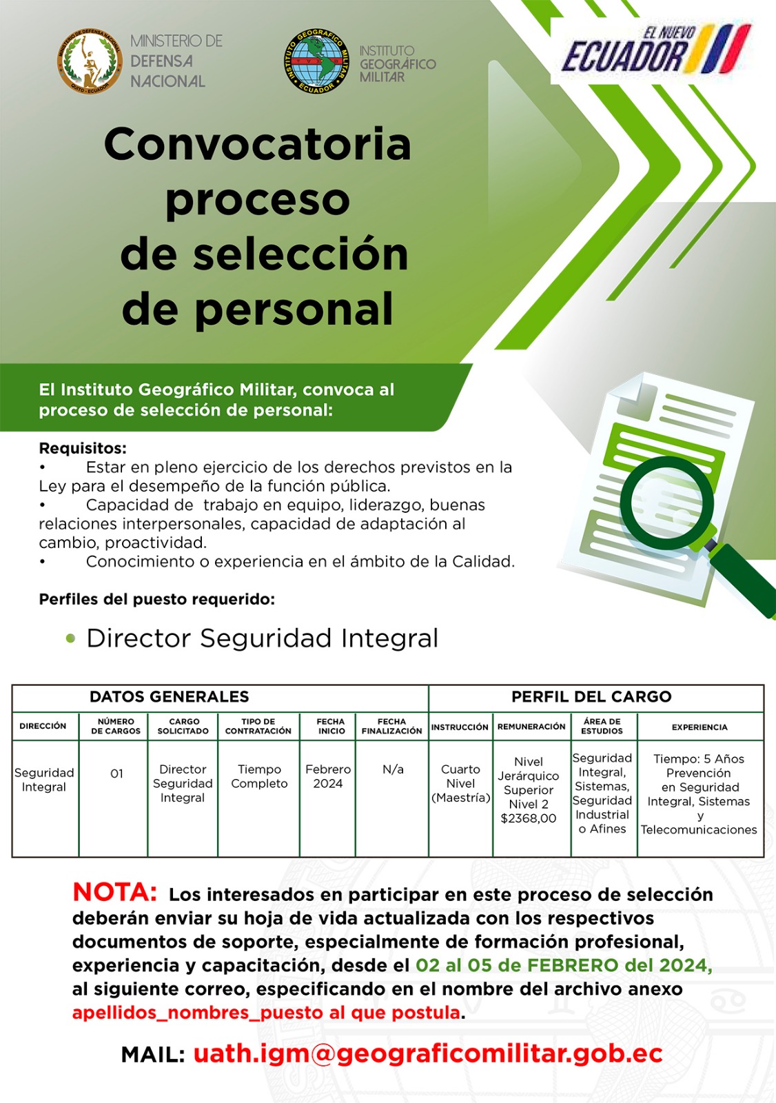 NOTA: Los interesados en participar en este proceso de selección deberán enviar su hoja de vida actualizada con los respectivos documentos de soporte, especialmente de formación profesional, experiencia y capacitación, desde el 2 al 5 de FEBRERO del 2024 al correo: uath.igm@geograficomilitar.gob.ec, especificando en el nombre del archivo anexo apellidos_nombres_puesto al que postula.