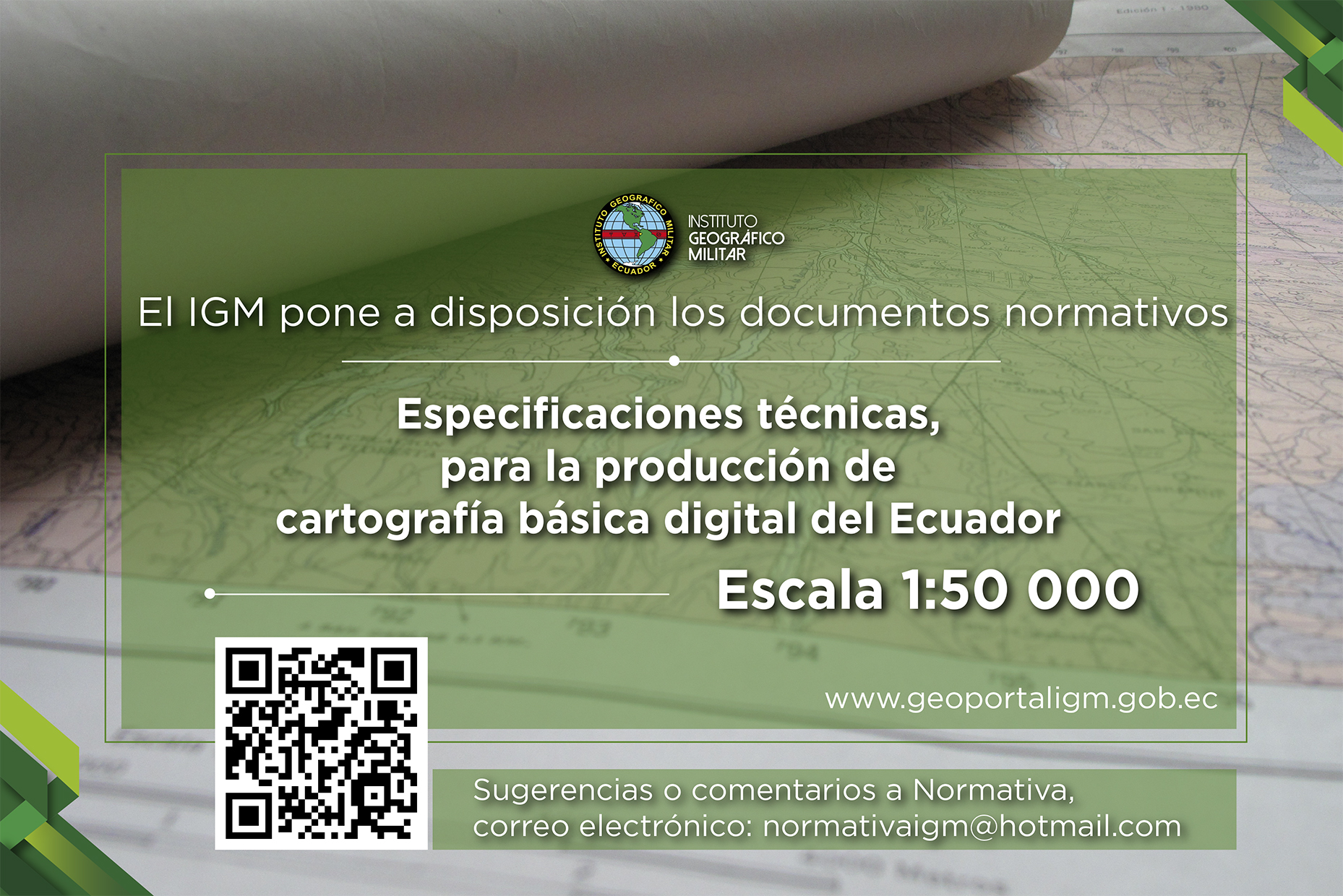 El Instituto Geográfico Militar Ecuador, pone a disposición los documentos normativos: Especificaciones Técnicas para la producción de cartografía básica digital del Ecuador a escala 1:50000, con el fin de ser revisados y retroalimentados por parte de los usuarios.