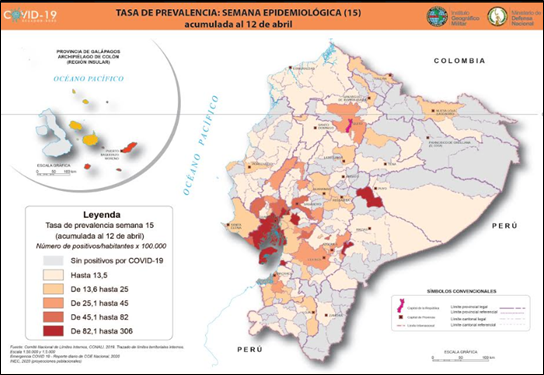 Dada la experticia del personal técnico del IGM en el ámbito geográfico y en coordinación con otras instituciones que son parte de la Sala Situacional: Instituto Nacional de Estadísticas y Censos (INEC),Ministerio de Telecomunicaciones (MINTEL),Centro de Inteligencia Estratégica (CIES),Servicio Nacional de Gestión de Riesgo (SNGRE), Ministerio de Salud (MSP), ejecuta un trabajo en conjunto, con el fin de articular la comunicación y sinergia para la realización de un modelamiento del territorio a través mapas y estudios geográficos que muestran, por ejemplo, mapas de prevalencia y de susceptibilidad a contagio por el COVID-19 en el país.