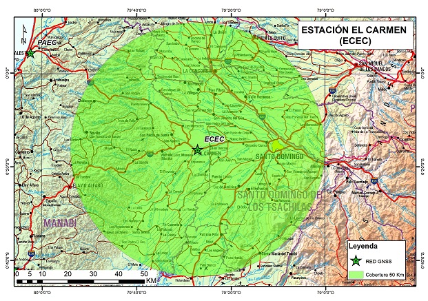 El Instituto Geográfico Militar dispone de una Estación GNSS de Monitoreo Continuo localizada en la ciudad de El Carmen, la misma que dispone de soluciones diarias en formato nativo y RINEX, así como también, proporciona el servicio de correcciones diferenciales en tiempo real mediante el protocolo NTRIP, de manera gratuita a toda la comunidad de usuarios y en beneficio de los pobladores de la Provincia de Manabí y Santo Domingo de los Tsáchilas.