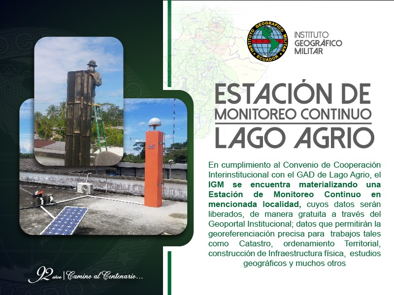 Es competencia y responsabilidad del Instituto Geográfico Militar, la planificación, organización, dirección, coordinación, ejecución, aprobación y control de las actividades tendientes a la elaboración de la Cartografía Nacional, bajo este contexto y en cumplimiento al Convenio de Cooperación Interinstitucional con el GAD de Lago Agrio, el IGM se encuentra materializando una Estación de Monitoreo Continuo en dicha localidad.