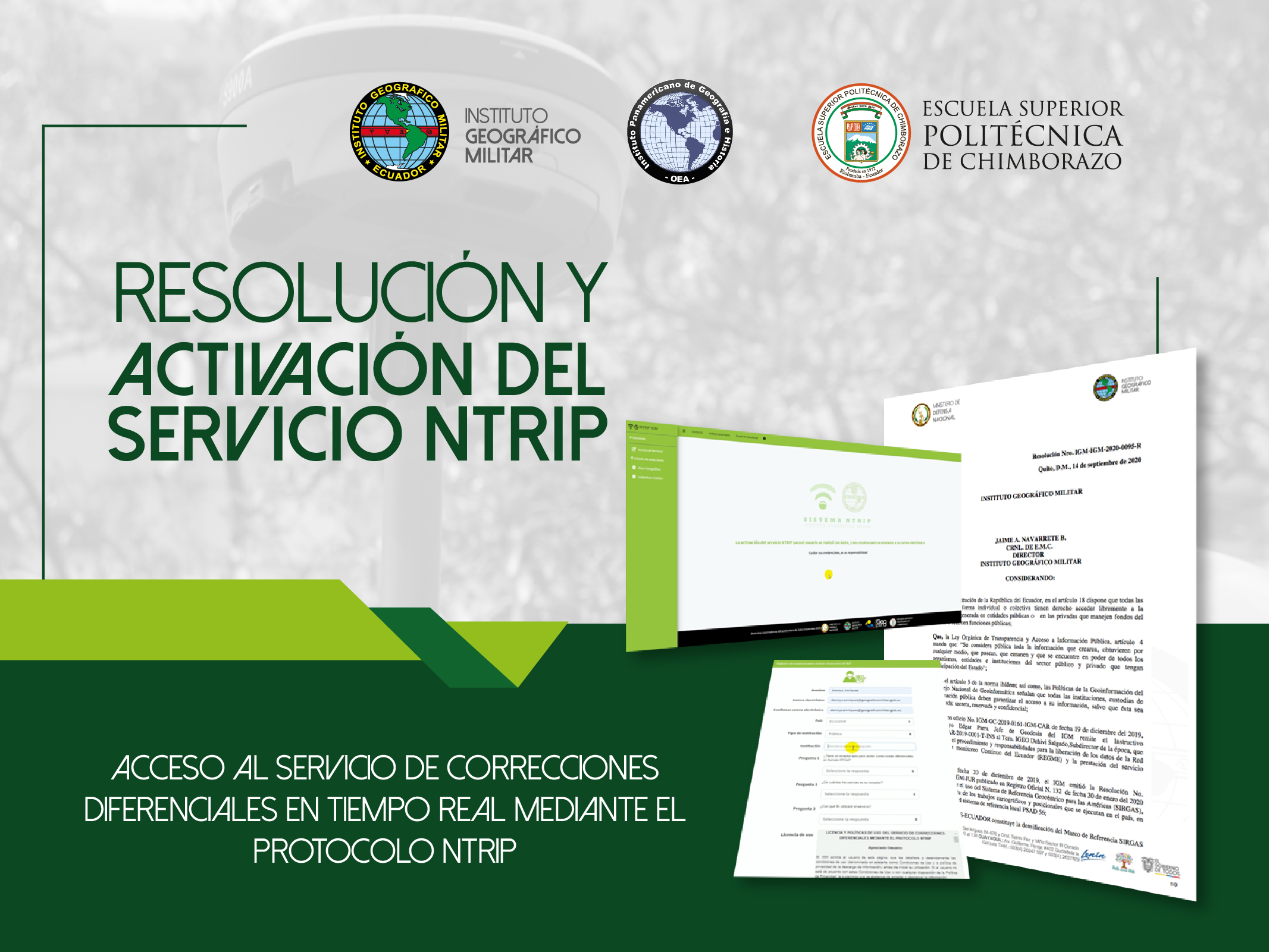 El Instituto Geográfico Militar mediante Resolución Nro. IGM-IGM-2020-0095-R, declara: “Publicar la Licencia y emitir las políticas de uso del Servicio de Correcciones Diferenciales mediante el Protocolo NTRIP, otorgando al usuario el derecho gratuito y no exclusivo de utilizar la información sujeta a esta licencia… ”