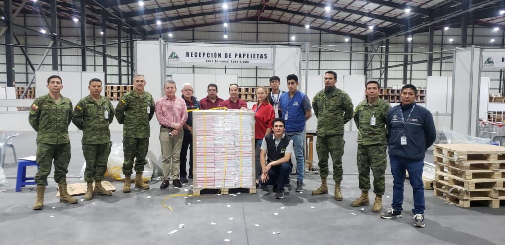 En el marco del contrato para la impresión de Papeletas Electorales y Documentos Electorales, suscrito con el Consejo Nacional Electoral del Ecuador, para las Elecciones Anticipadas 2023, autoridades del Instituto Geográfico Militar Ecuador, supervisan la ÚLTIMA ENTREGA del material electoral, a la empresa integradora Montgar.