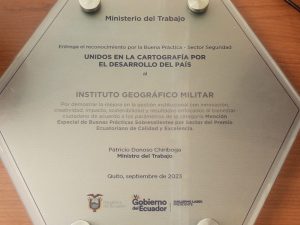 En este evento, se realizó el reconocimiento por la Buena Práctica – Sector Seguridad “Unidos en la Cartografía por el Desarrollo del País”, al Instituto Geográfico Militar del Ecuador, por demostrar la mejora en la gestión institucional con innovación, creatividad, impacto, sostenibilidad y resultados enfocados al bienestar ciudadano de acuerdo a los parámetros de las categoría Mención Especial de Buenas Prácticas Sobresalientes por Sector del Premio Ecuatoriano de la Calidad y Excelencia.