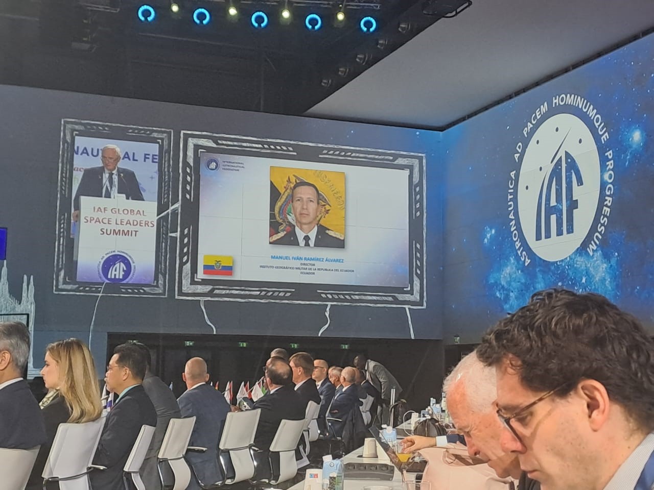 El pasado octubre, el CRNL. EMC Manuel Iván Ramírez Álvarez, director del Instituto y en representación de Ecuador, formó parte del 75° Congreso Internacional de Astronáutica-IAC, llevado a cabo en Milán-Italia, organizado por la Federación Astronáutica Internacional; un evento de gran relevancia que reunió a los principales actores del ámbito aeroespacial a nivel mundial.