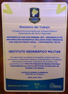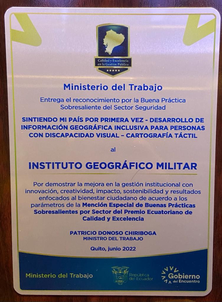 En ese sentido, el Instituto Geográfico Militar ganó la Mención Especial de Buenas Prácticas Sobresalientes por Sector Denominada «Sintiendo mi país por primera vez.- Desarrollo de información geográfica inclusiva para personas con discapacidad visual – CARTOGRAFÍA TÁCTIL» bajo los parámetros del Reglamento del Premio Ecuatoriano de Calidad y Excelencia.