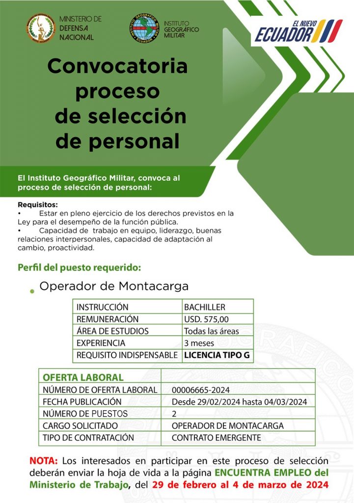 El Instituto Geográfico Militar, convoca al proceso de selección de personal para: