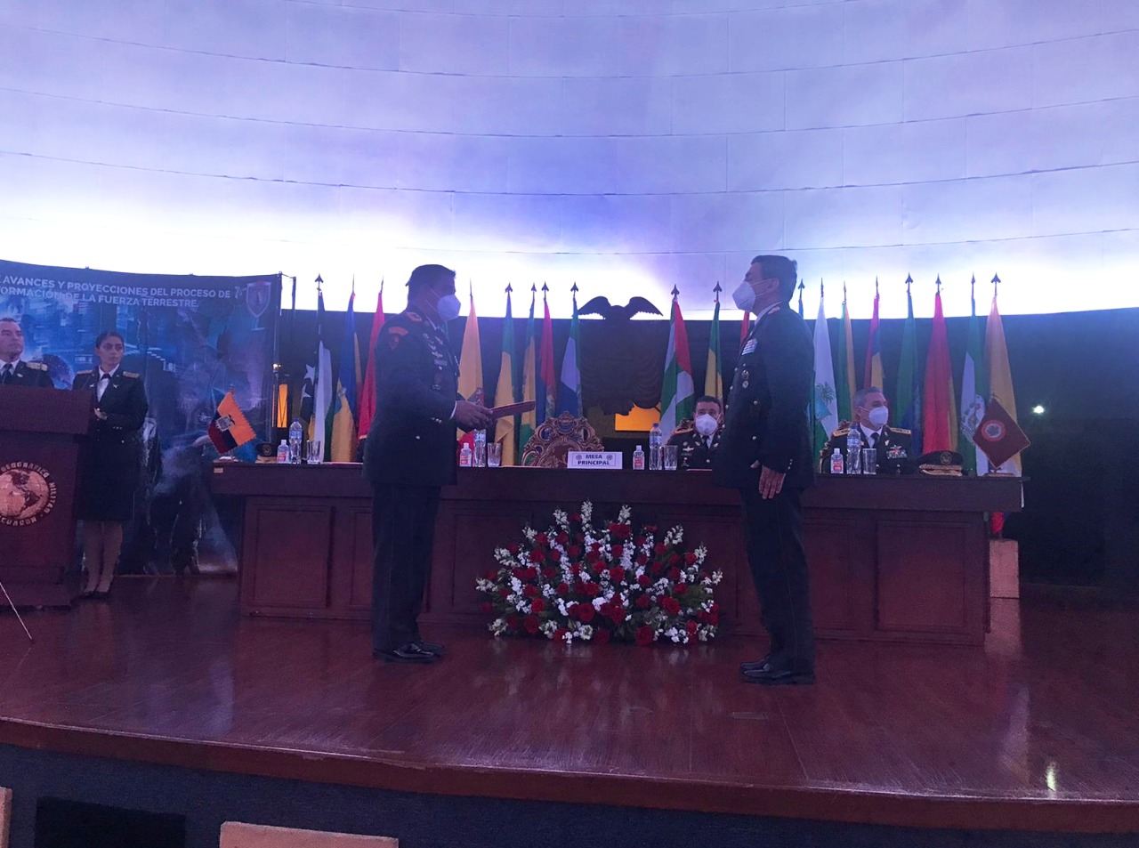 En el marco del Seminario de Avances y Proyecciones del proceso de Transformación de la Fuerza Terrestre, realizado en el Instituto Geográfico Militar, el señor GRAB. Santiago Almeida, Inspector General del Ejército, realizó el reconocimiento al señor CRNL. de EMC. Pablo Acosta A., Director del IGM, por la colaboración brindada durante el desarrollo de dicho evento.