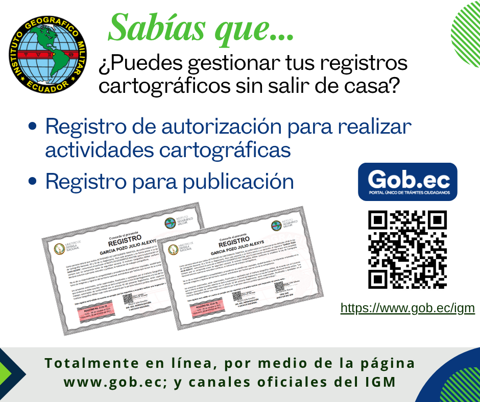 El Instituto Geográfico Militar (IGM) informa a la ciudadanía, entidades públicas y privadas que los procesos de Registro de autorización para realizar actividades cartográficas y Registro para publicación se ejecutan de manera totalmente en línea.