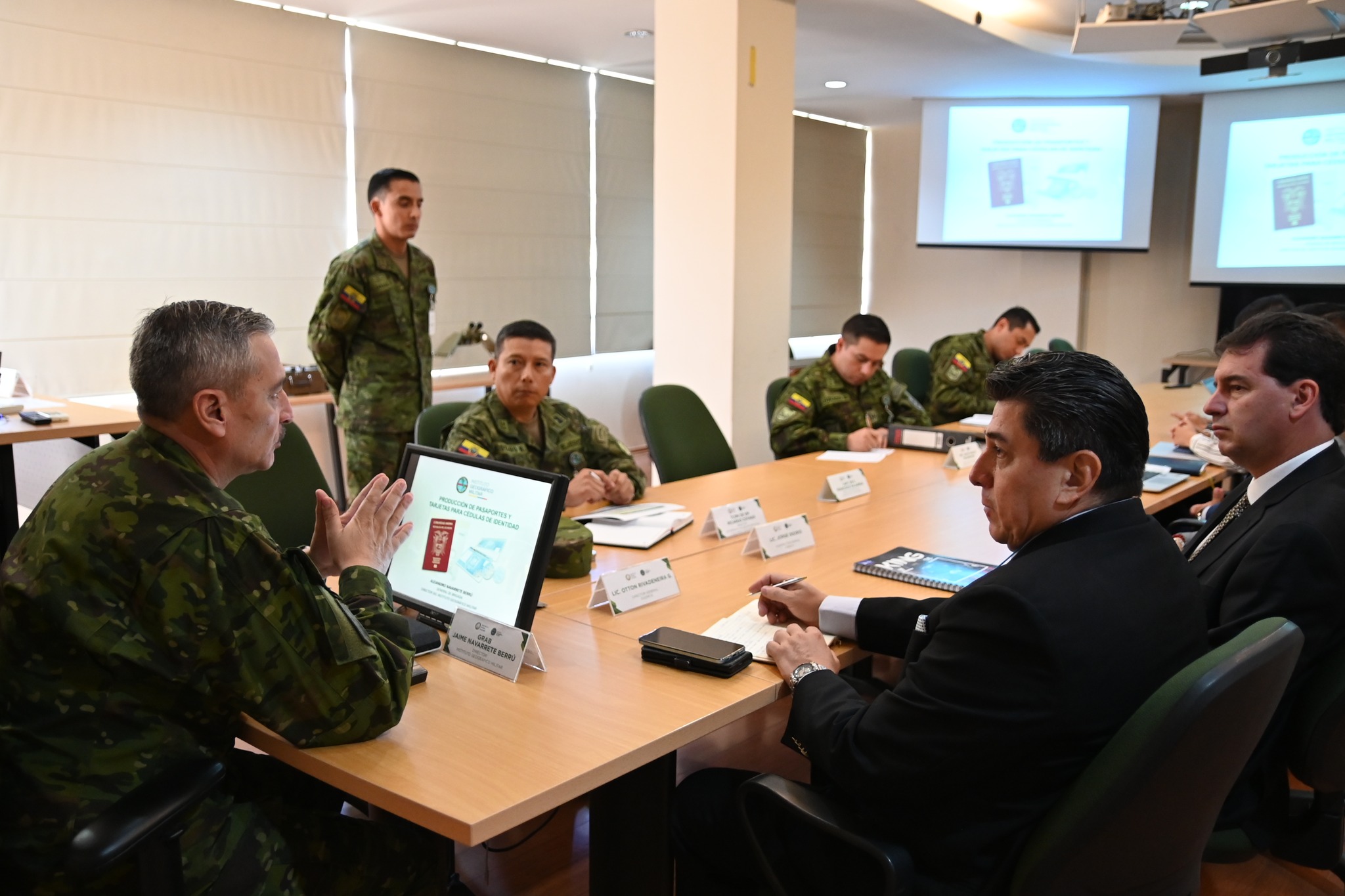 El señor Grab. Jaime Navarrete, Director del Instituto Geográfico Militar del Ecuador acompañado de los Directivos de la institución, recibieron la grata visita oficial del Lic. Otton Rivadeneira, Director General del Registro Civil Ecuador, Lic. Jorge Osorio, Subdirector y junto a su equipo de trabajo mantuvieron una reunión, en la cual, conocieron sobre los avances de los proyectos emblemáticos que el IGM mantiene con dicho organismo del Estado, como son: cédulas de identidad y pasaportes.