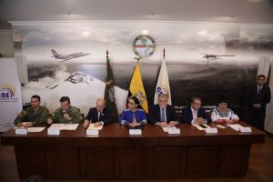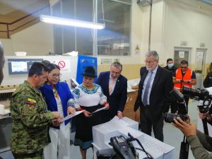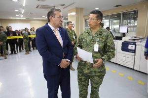 El Crnl. de EMC. César Andrés Villacís, Director del Instituto Geográfico Militar Ecuador conjuntamente con el Vicealmirante Rafael Poveda, Viceministro del Ministerio Defensa Ecuador, junto a las autoridades del Consejo Nacional Electoral del Ecuador, participó de la rueda de prensa, para verificar los avances en el proceso de impresión de papeletas y documentos electorales, que lleva a cabo el IGM.