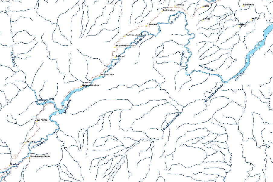 - El Río Quijos continúa aguas abajo, en el que desemboca el Río Reventador, continuando su recorrido el mismo Río Quijos.