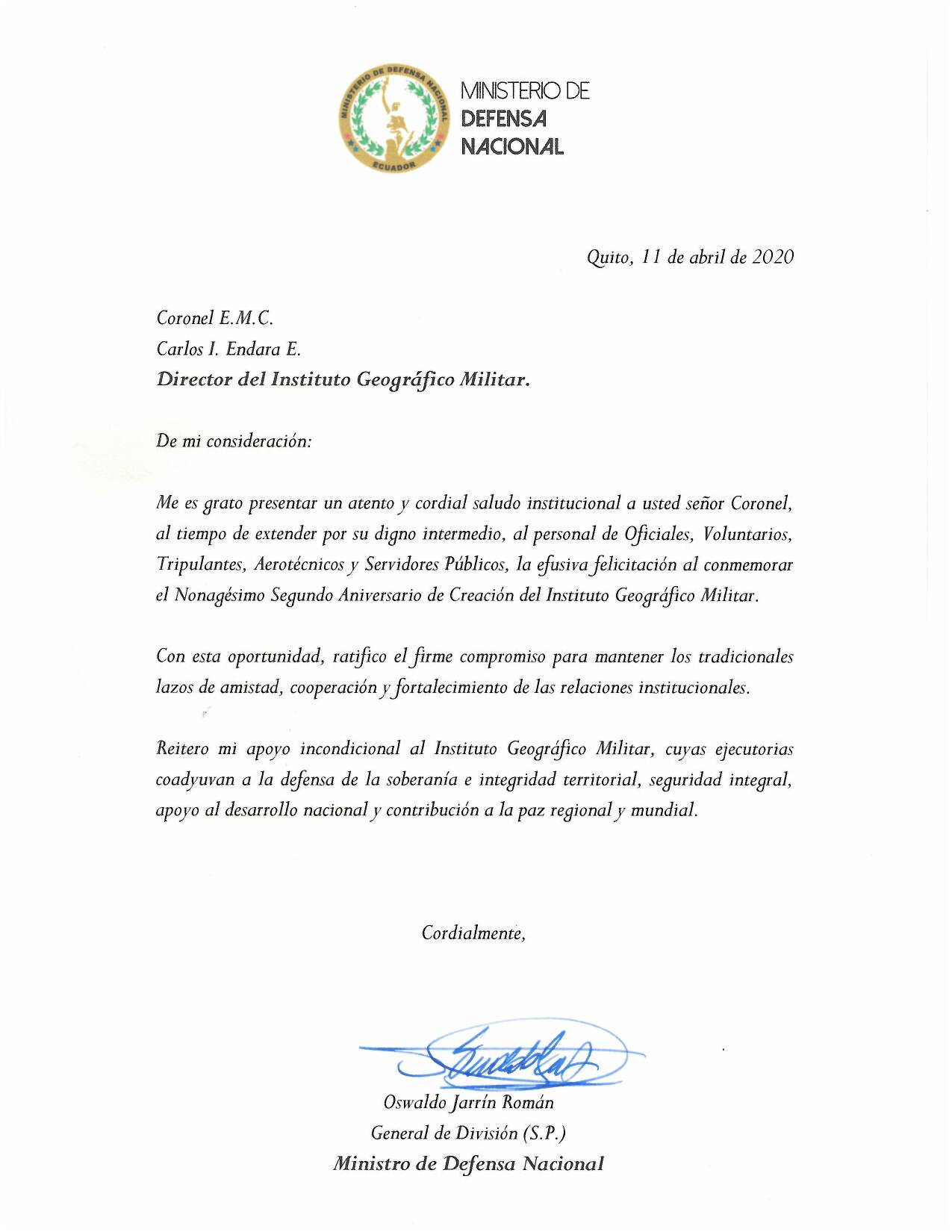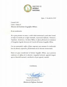 Saludo del señor General de División (S.P.) Oswaldo Jarrín Román, Ministro de Defensa Nacional del Ecuador, al conmemorar el Nonagésimo Segundo Aniversario de Creación del Instituto Geográfico Militar.